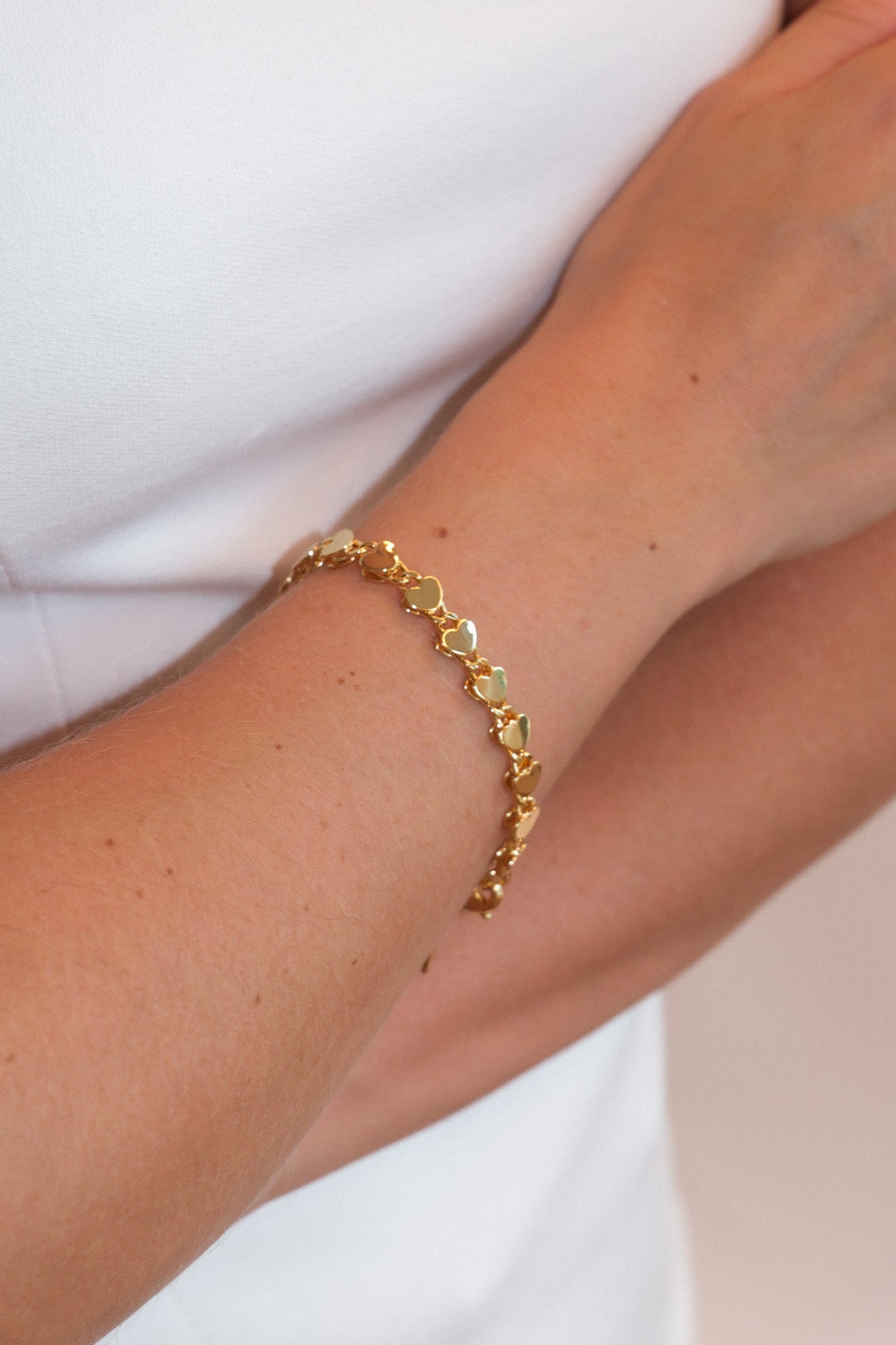 Our Lovers Bracelet is the ultimate option for a dainty gold heart bracelet, featuring a captivating chain of intertwined gold heart links. This elegant bracelet offers delicate sparkle, perfect for everyday wear or layering gold jewelry.