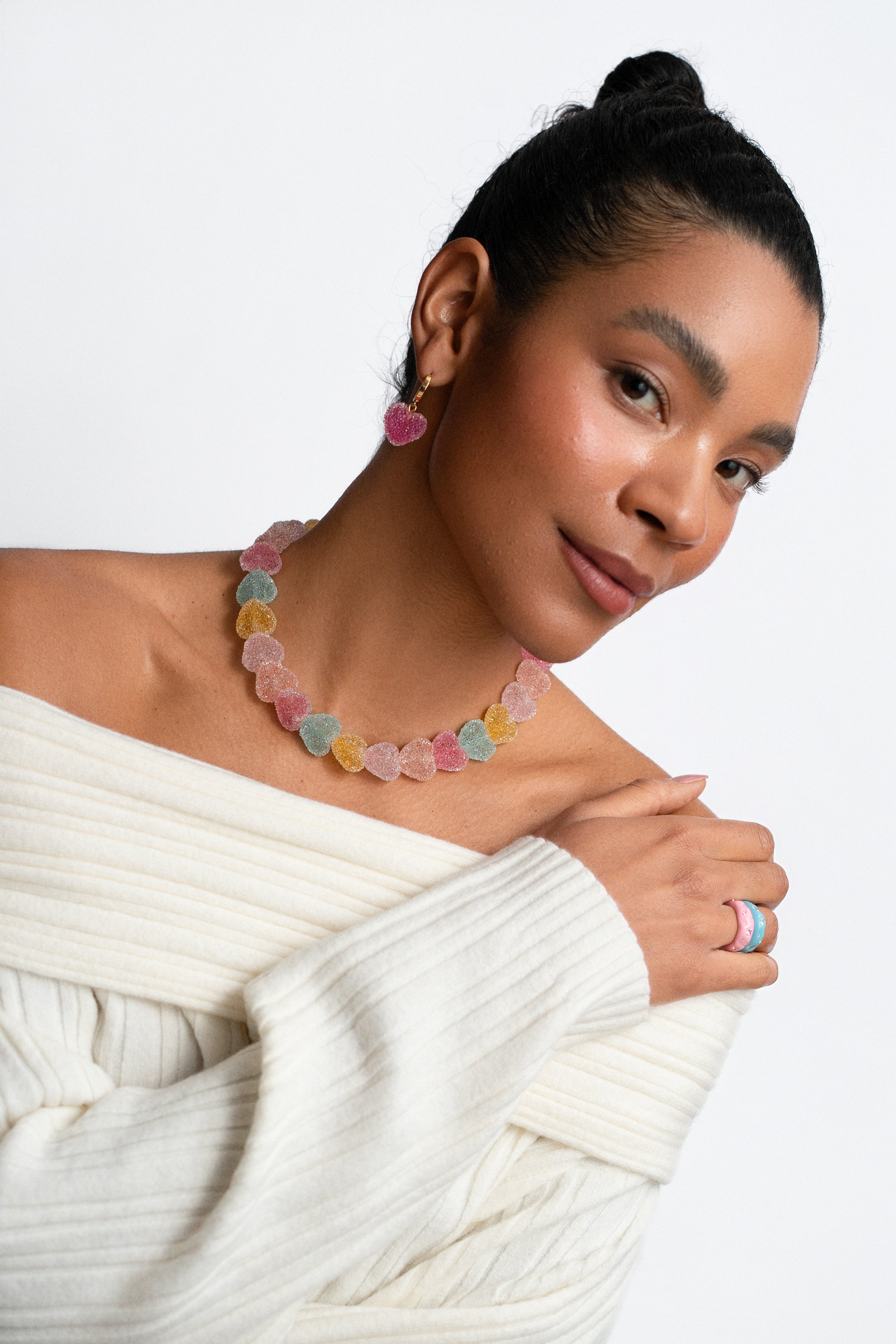 Our Jelly Hearts were lovingly created as a stylish upgrade from your childhood corner shop’s candy jewellery. The sugar-coated hearts were created as a nostalgic reminder of edible jewelry of the 90s and 00s and is a fun way to inject some sweet style into your wardrobe.