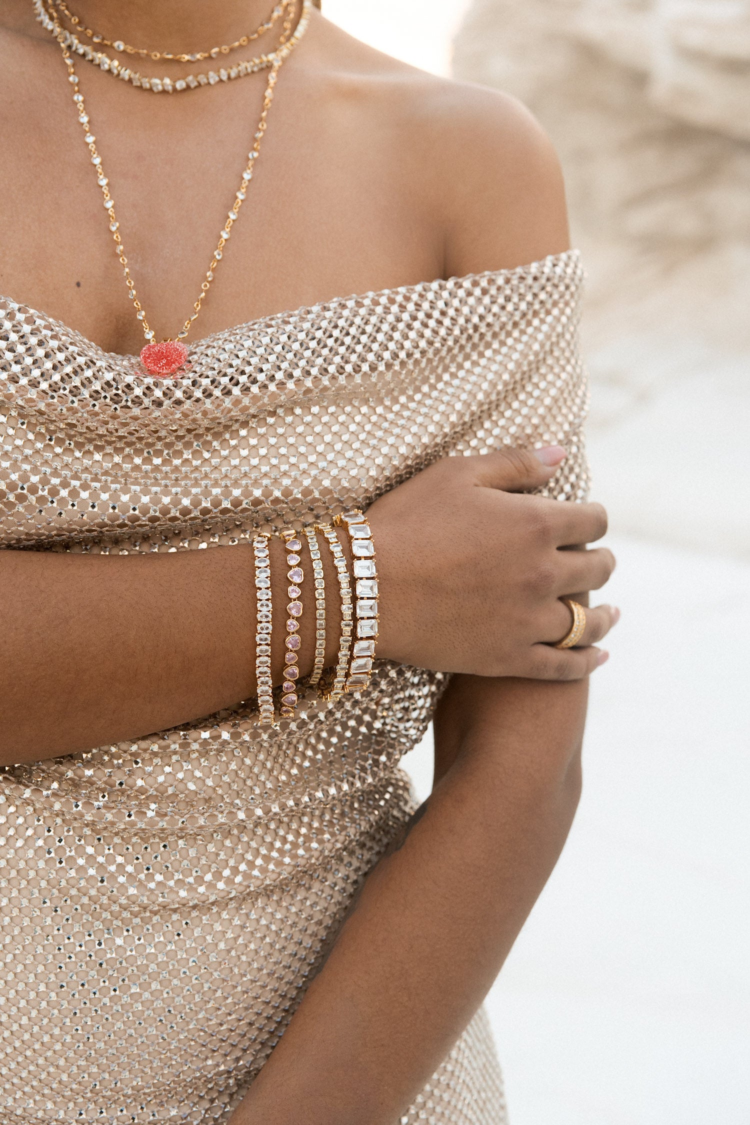 Each heart is thoughtfully linked to create graceful movement around the wrist, forming a romantic silhouette that feels both playful and refined. The warm gold finish beautifully complements the blush-pink stones, giving the bracelet a luminous glow that catches the light from every angle.