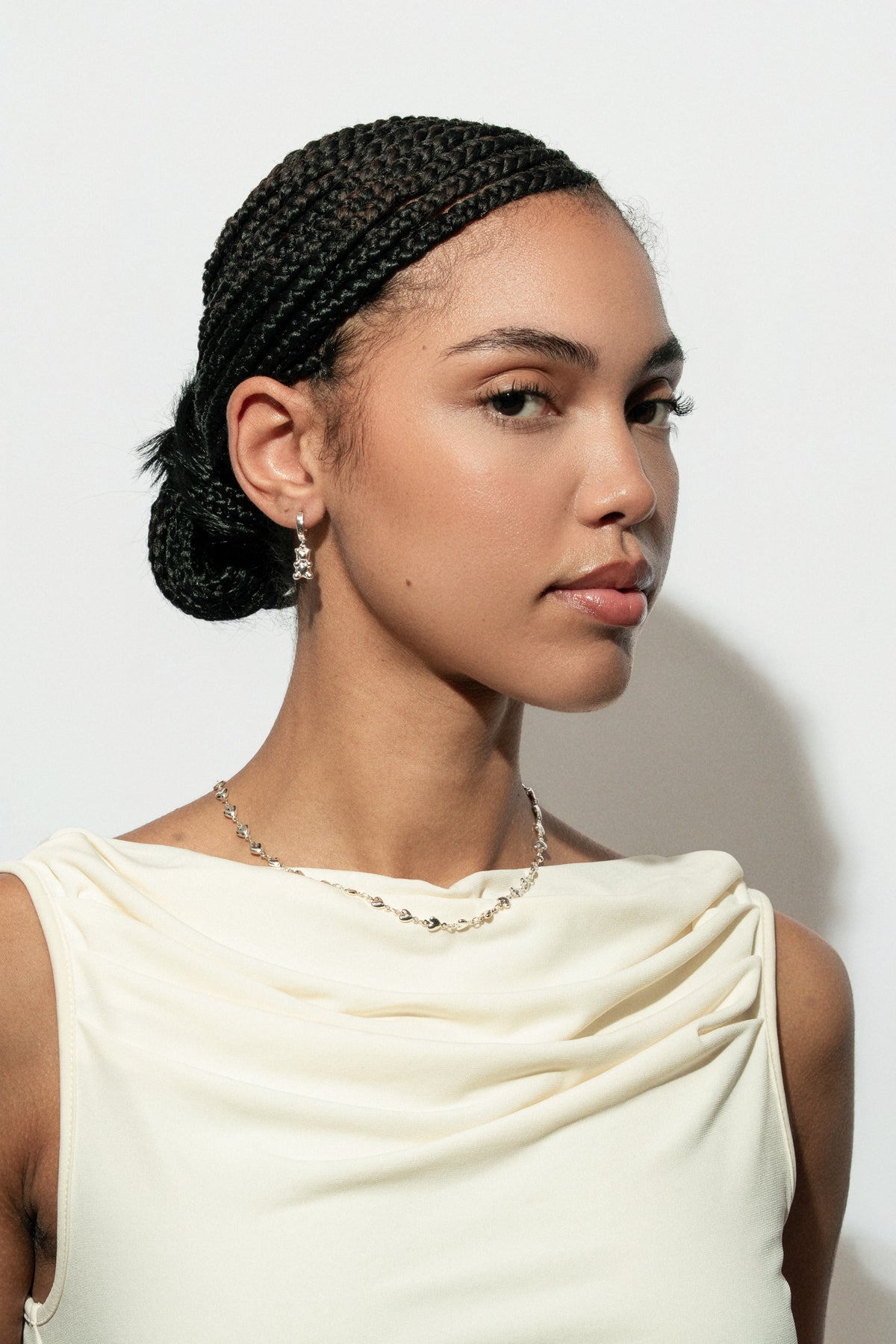 Crafted in a sleek silver-toned finish, the design offers a clean and contemporary feel while maintaining a romantic essence. Its lightweight construction makes it perfect for everyday wear, whether worn alone for a refined touch or layered for a more personalized style.