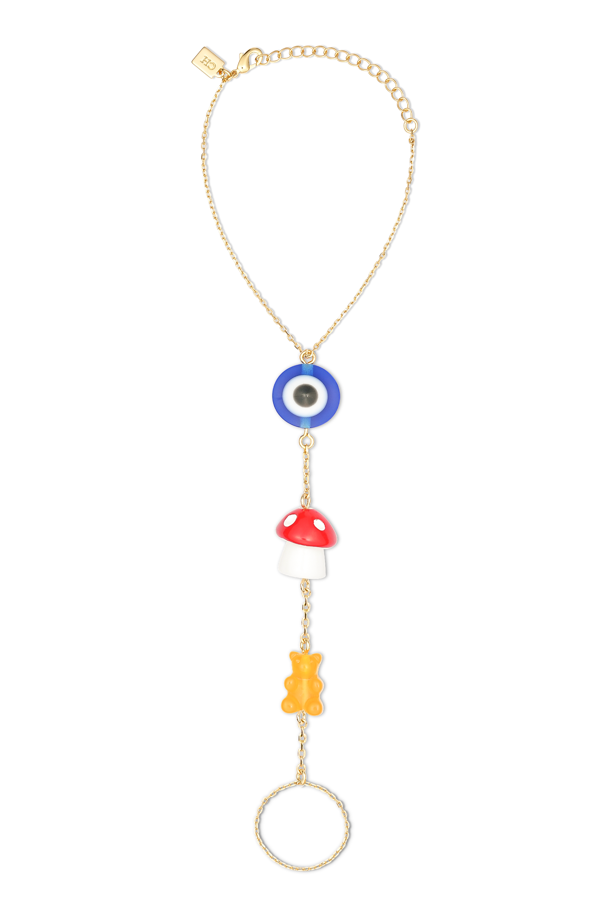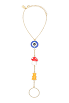 Bold, playful, and full of personality, the Protected Fun Hand Harness blends whimsical charm with eye-catching style. This unique hand harness features a delicate gold-tone chain connecting wrist to finger, adorned with colorful statement charms including a vibrant evil eye for protection, a playful mushroom, and a sweet gummy bear accent.